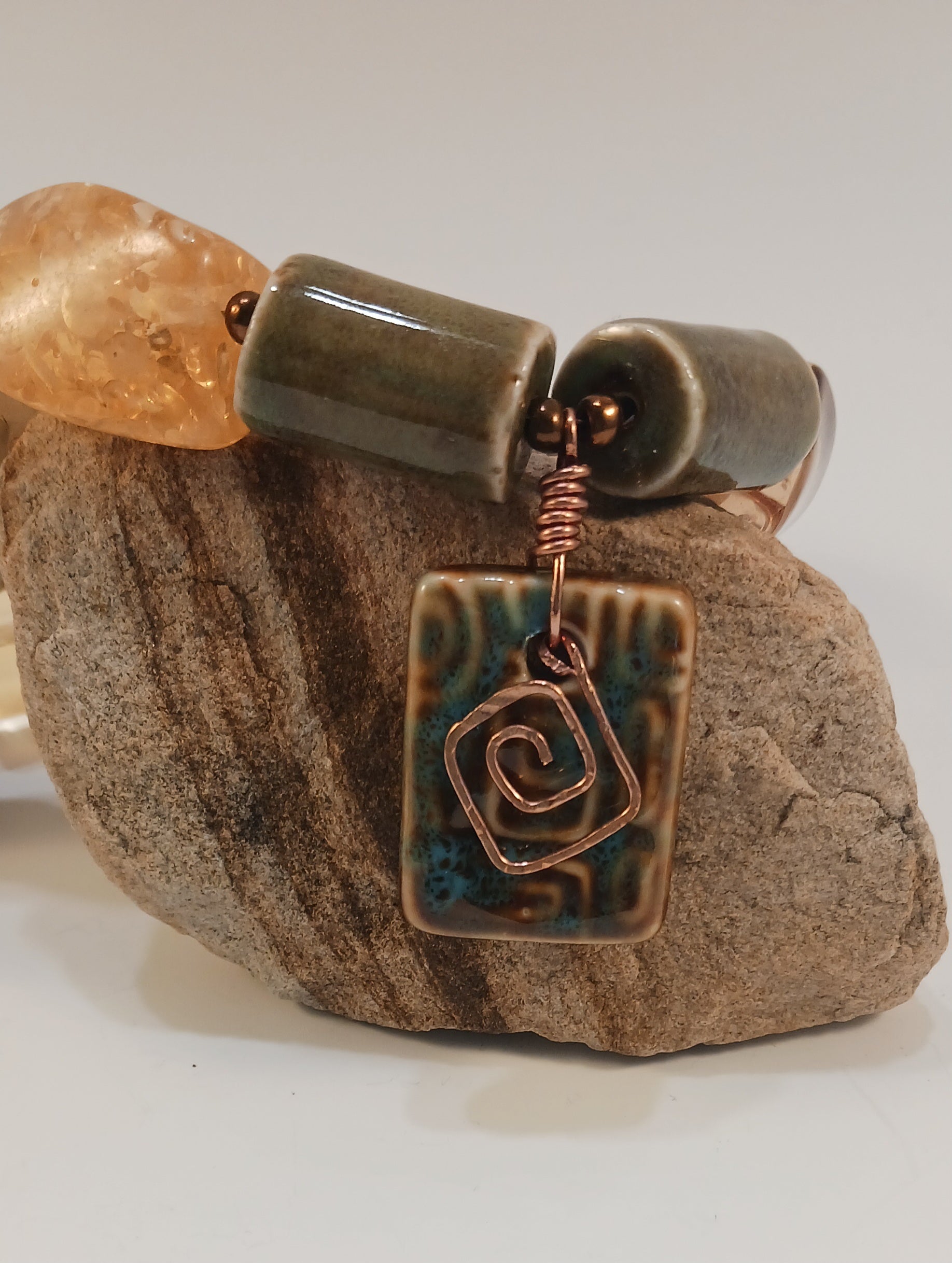This hand crafted statement necklace features a striking ceramic focal bead enhanced with a copper wire overlay, complemented by smooth acrylic beads. Measuring 24 inches in length, with a toggle closure, it offers a bold yet refined accessory to elevate any ensemble with artistic elegance and unique craftsmanship.